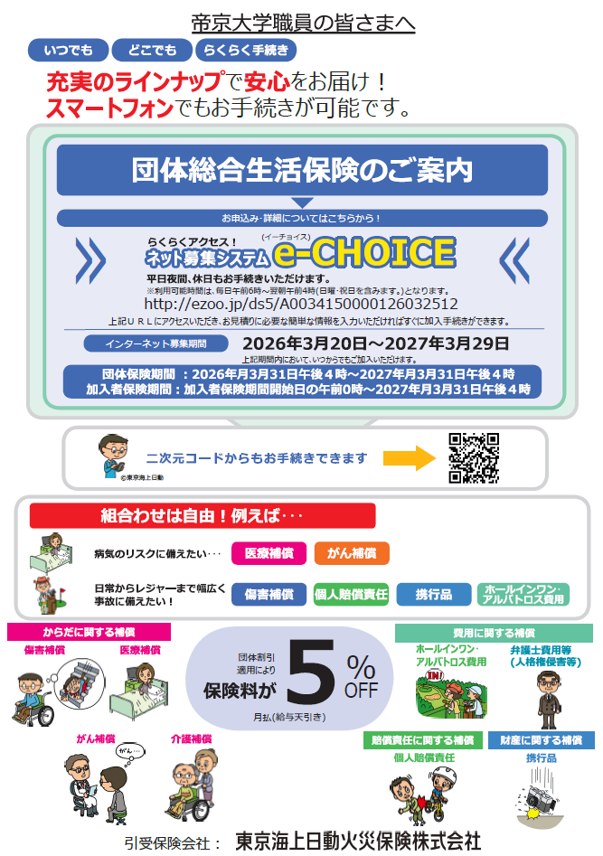 当社は東京海上日動火災保険株式会社の代理店です。帝京大学グループ関係者を中心に各種保険をご案内しております。各種資料請求、新規加入のご相談、ご契約内容の確認・変更などがございましたら、お気軽にお問い合わせください。