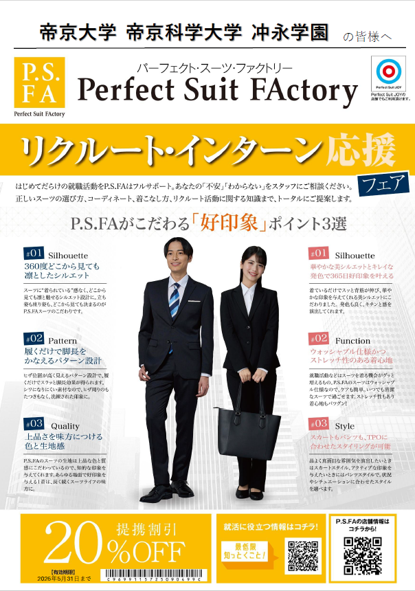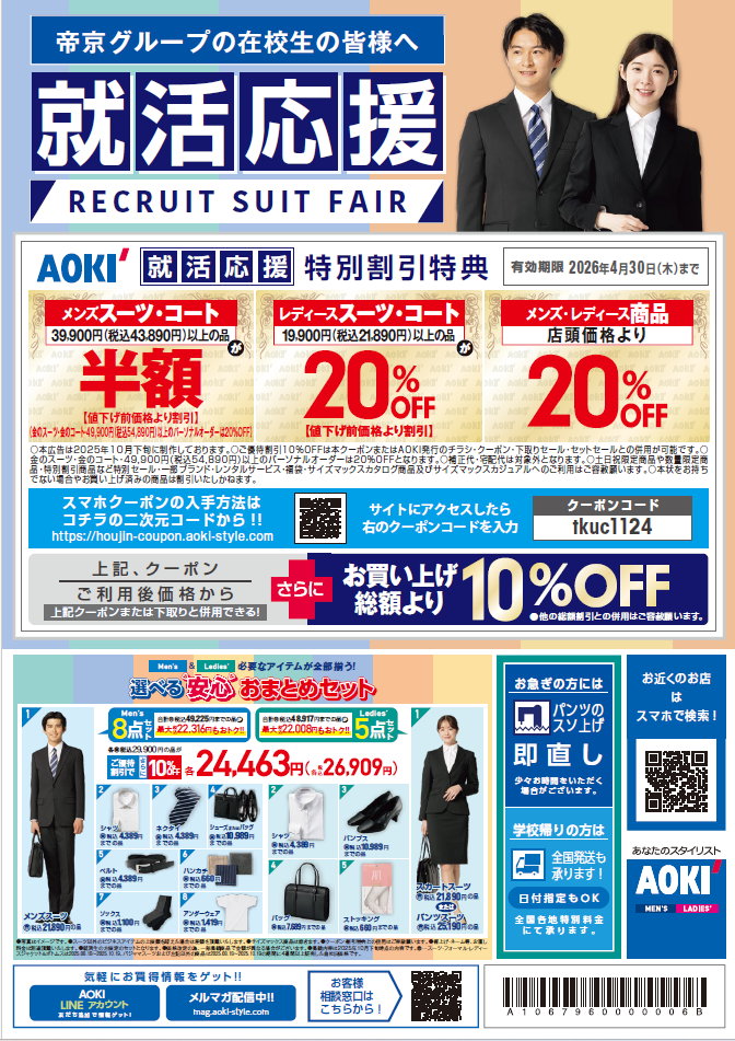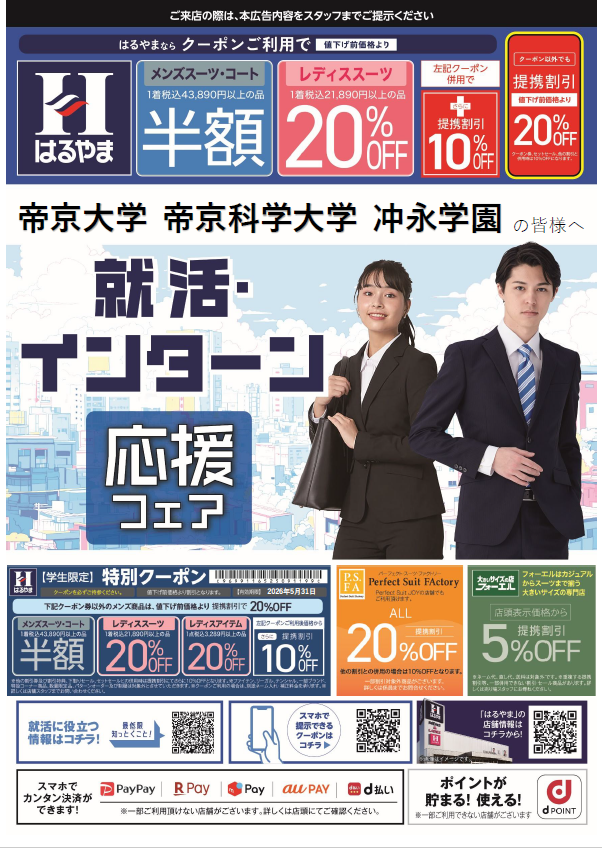 学生・教職員様向けに「はるやま(P. S. FA)・AOKI・コナカ」の優待割引クーポンを更新しました。