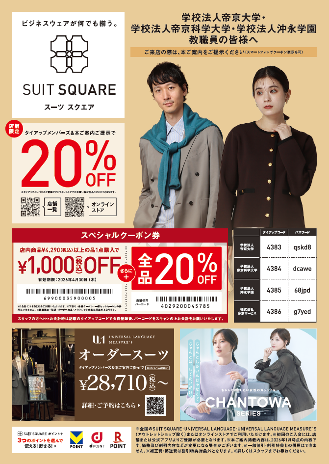 教職員様向けに、洋服の青山の優待割引クーポンを更新しました。